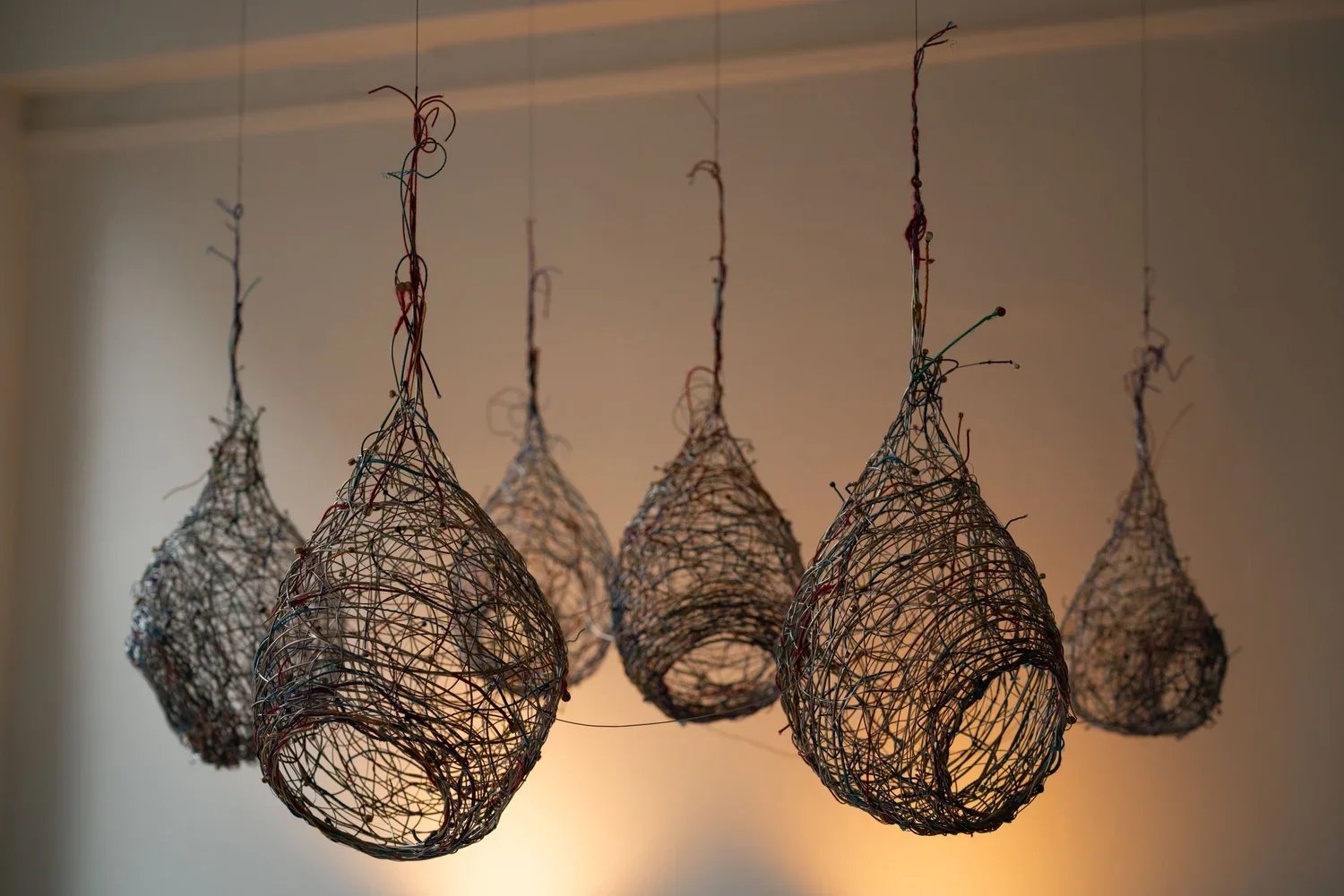 The Community is an evolving sculptural installation by Geoff Robertson. Composed of woven nests made from used, broken, and discarded instrument strings collected from musicians around the world, the piece evokes the intimacy, fragility, and resilience inherent in musical practice. Inspired by the artist’s wife and collaborator, violinist Audrey Wright, it is both an homage to the world of classical musicians and a meditation on the invisible threads that connect communities of individuals. Each nest is handwoven by the artist, forming a subtle connection to the literal and metaphorical DNA of every musician who has played these strings. The grit and grime of musical practice is mirrored in the weaving of the nests, making both processes intensely personal and evocative of communal storytelling. The form of the bird’s nest is a recurring motif for the artist, and symbolizes the universal drive to construct a dedicated space for oneself. The work invites viewers to see the transformed strings not only as reclaimed materials but as carriers of memory, sound, and human connection.