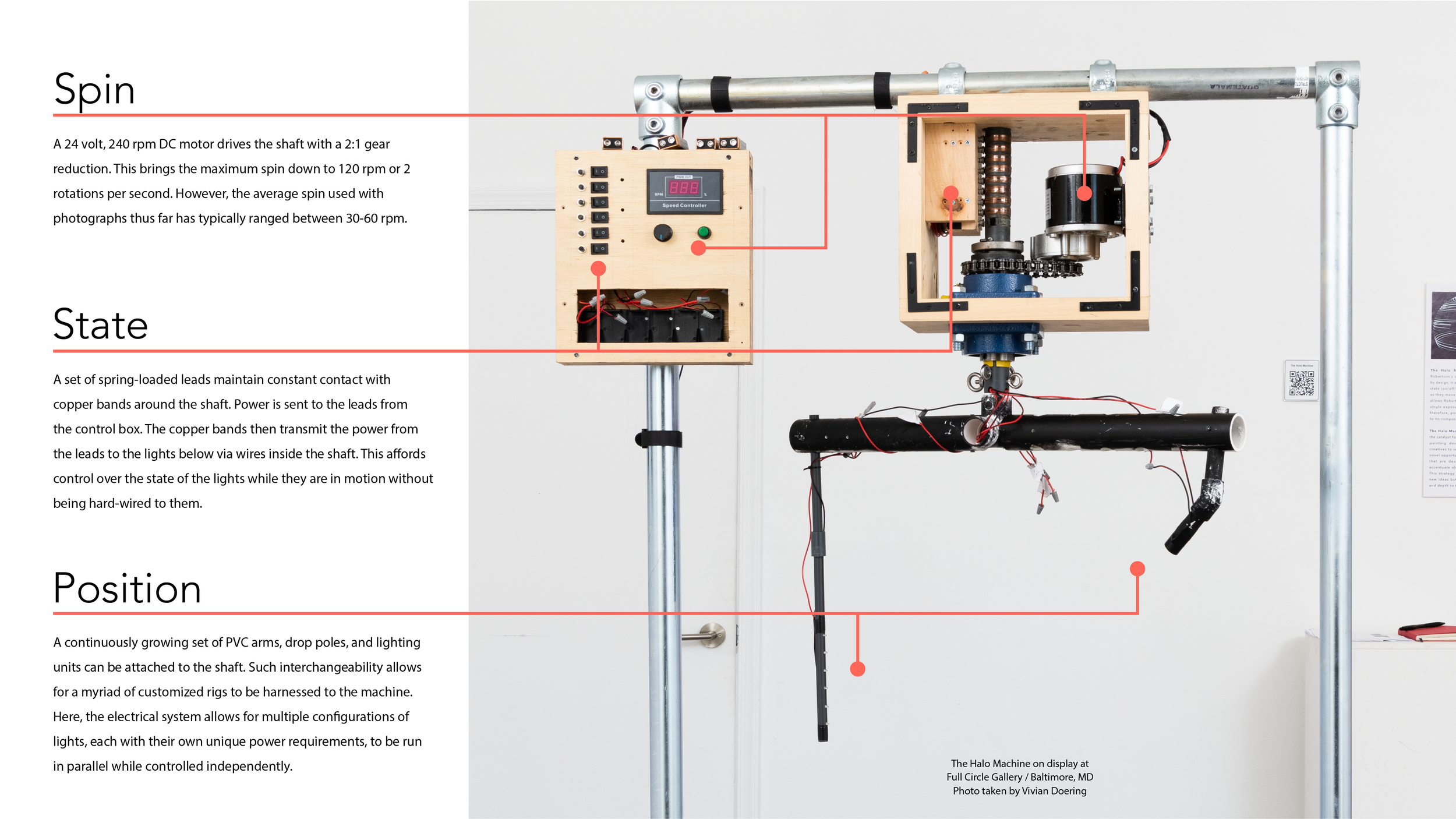 The construction of the Halo Machine started in January of 2020. It’s been a process of trial and error and iterations are still taking place. Half the battle has been figuring out what to call the parts / mechanisms visualized in my head and then how to obtain them. Having that said, I think the best way to explain how I’ve gone about building the Halo Machine is to break it down by my approach to controlling the spin, state (on/off), and position of the LED lights that generated the images seen at the top of this page.